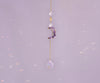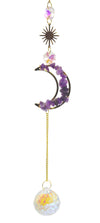 A crescent-shaped suncatcher, adorned with purple amethyst and sparkling crystals that glitter like tiny stars. It creates an atmosphere of peace, protection, and quiet magic.