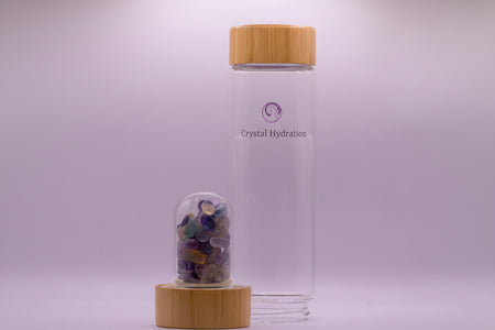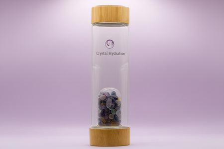 Each crystal bottle embodies beauty, energy, and mindfulness. Crafted from clear borosilicate glass with a soft bamboo lid, it contains genuine gemstones such as amethyst, rose quartz, and many more.